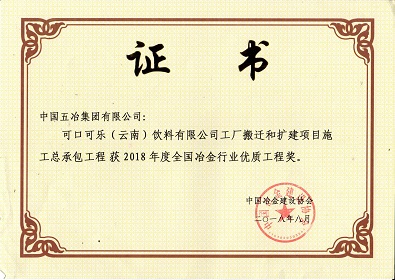 可口可樂(云南)飲料有限公司工廠搬遷和擴(kuò)建項(xiàng)目施工總承包安裝工程-2018年度全國(guó)冶金行業(yè)優(yōu)質(zhì)工程獎(jiǎng)