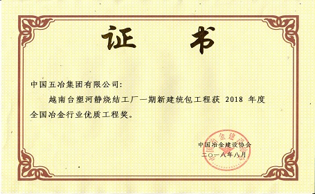 越南臺(tái)塑河靜燒結(jié)工廠一期新建統(tǒng)包工程——2018年全國冶金行業(yè)優(yōu)質(zhì)工程獎(jiǎng)