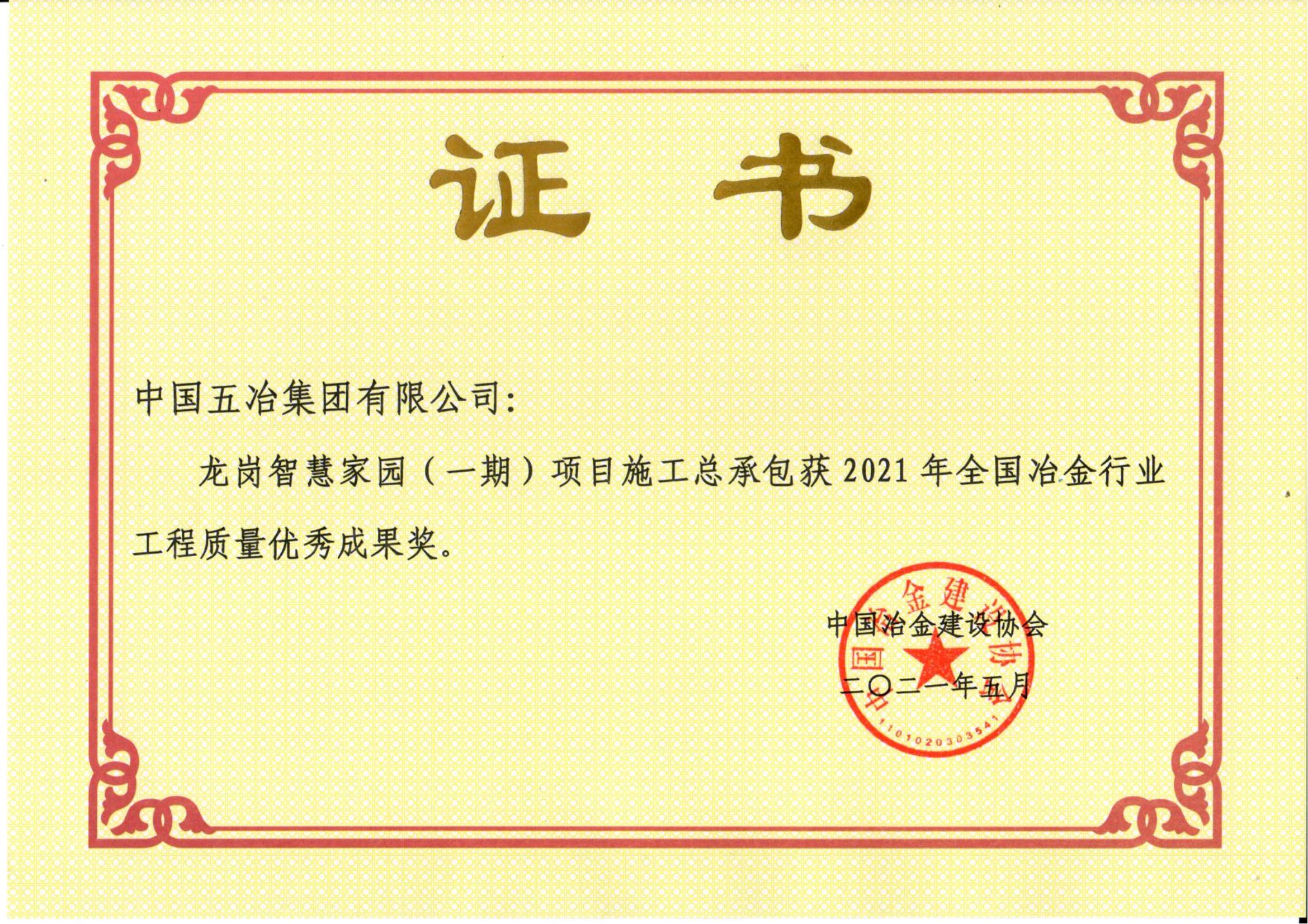 龍崗智慧家園(一期)項目施工總承包獲2021年全國冶金行業(yè)工程質量優(yōu)秀成果獎