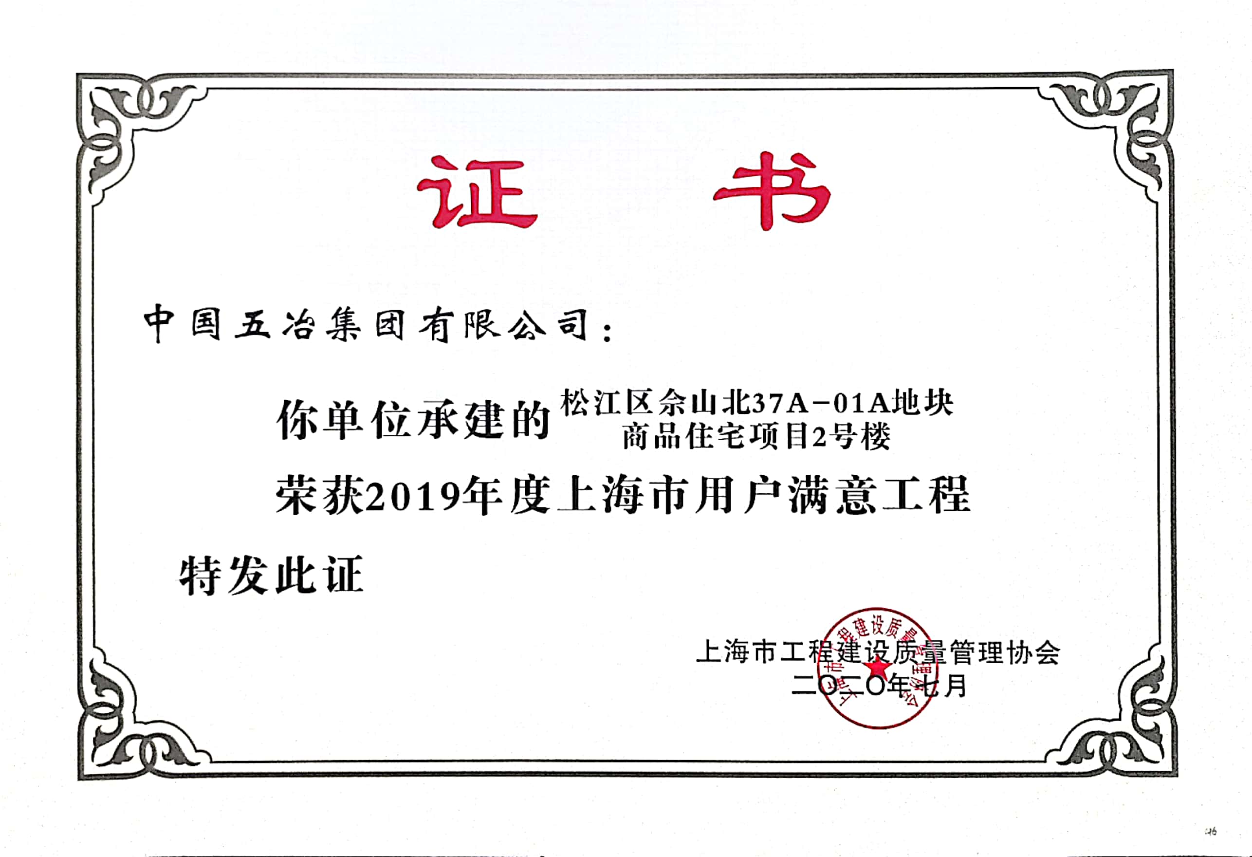 松江區(qū)佘山北37A-01A地塊商品住宅項目2號樓榮獲2019年度上海市用戶滿意工程
