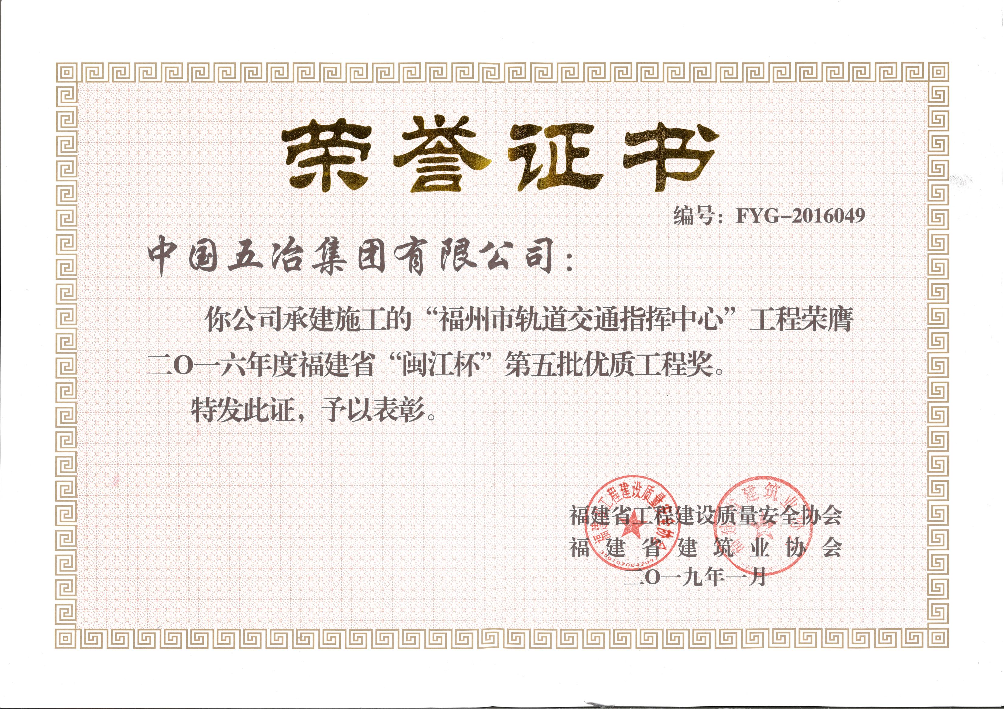 福州市軌道交通指揮中心工程榮膺二0一六年度福建省“閩江杯”第五批優(yōu)質工程獎