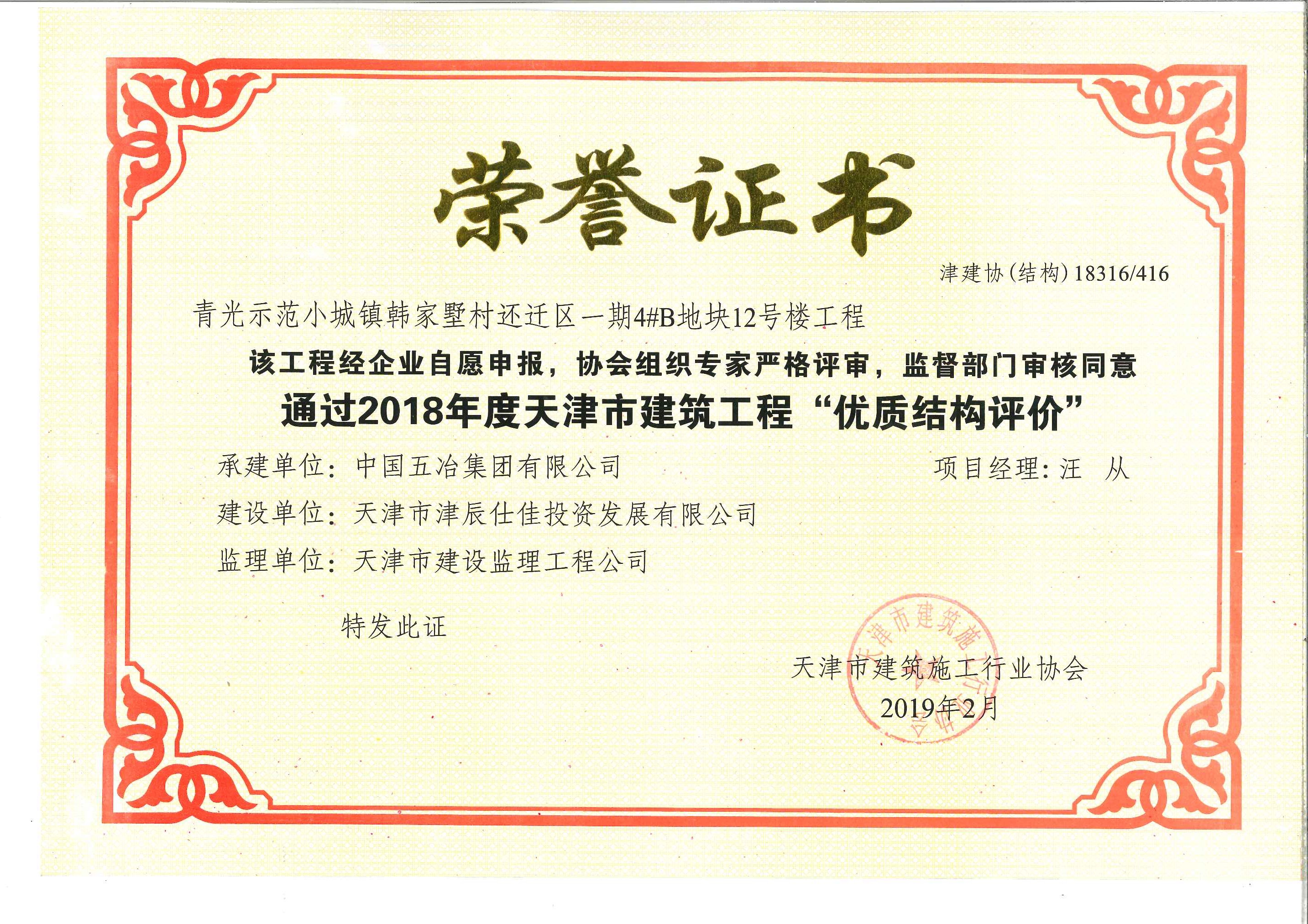 青光示范小城鎮(zhèn)韓家墅村還遷區(qū)-期4#B地塊12號樓工程--2018年度天津市建筑工程“優(yōu)質(zhì)結(jié)構(gòu)評價(jià)”
