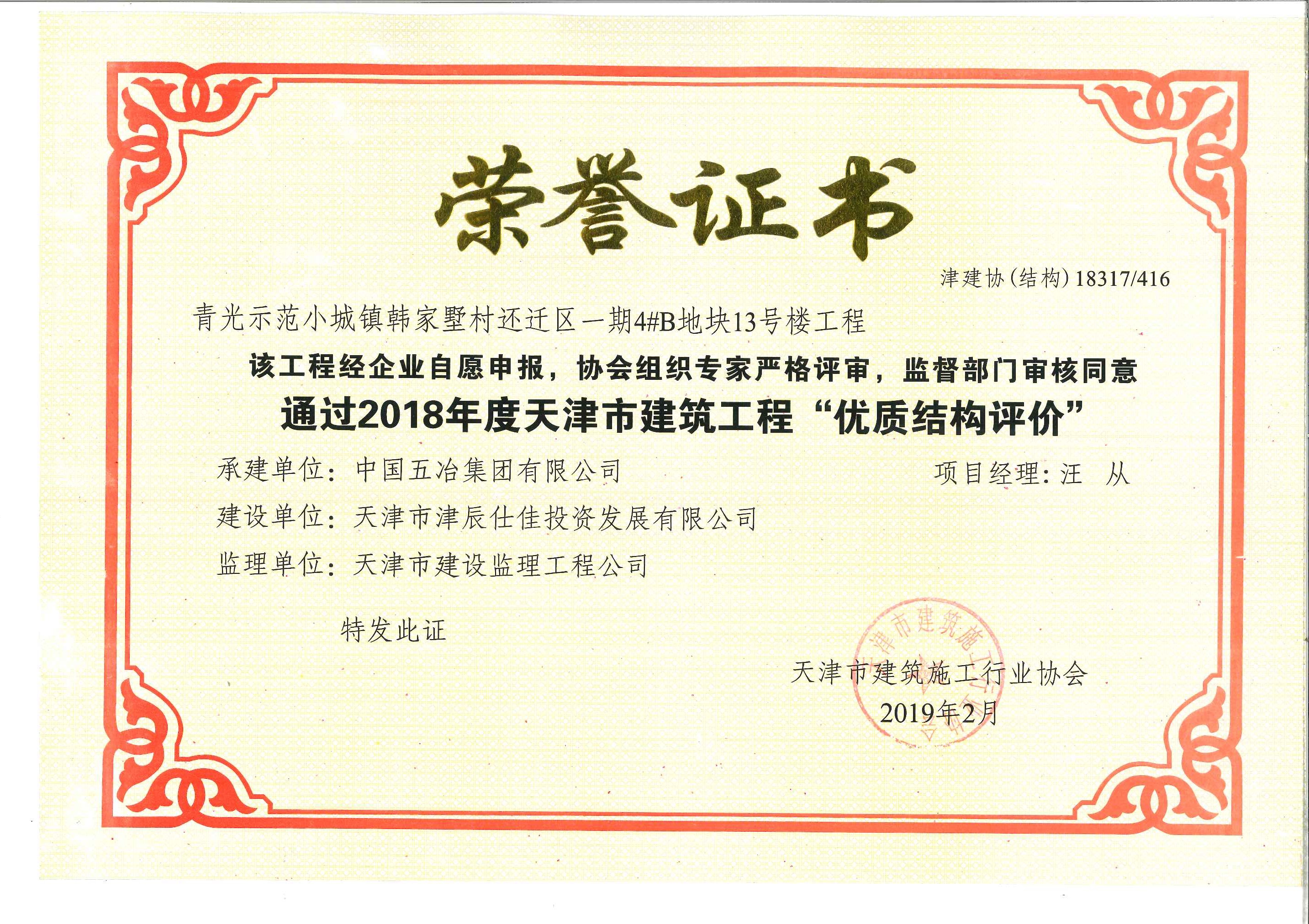 青光示范小城鎮(zhèn)韓家墅村還遷區(qū)-期4#B地塊13號樓工程--2018年度天津市建筑工程“優(yōu)質(zhì)結(jié)構(gòu)評價(jià)”