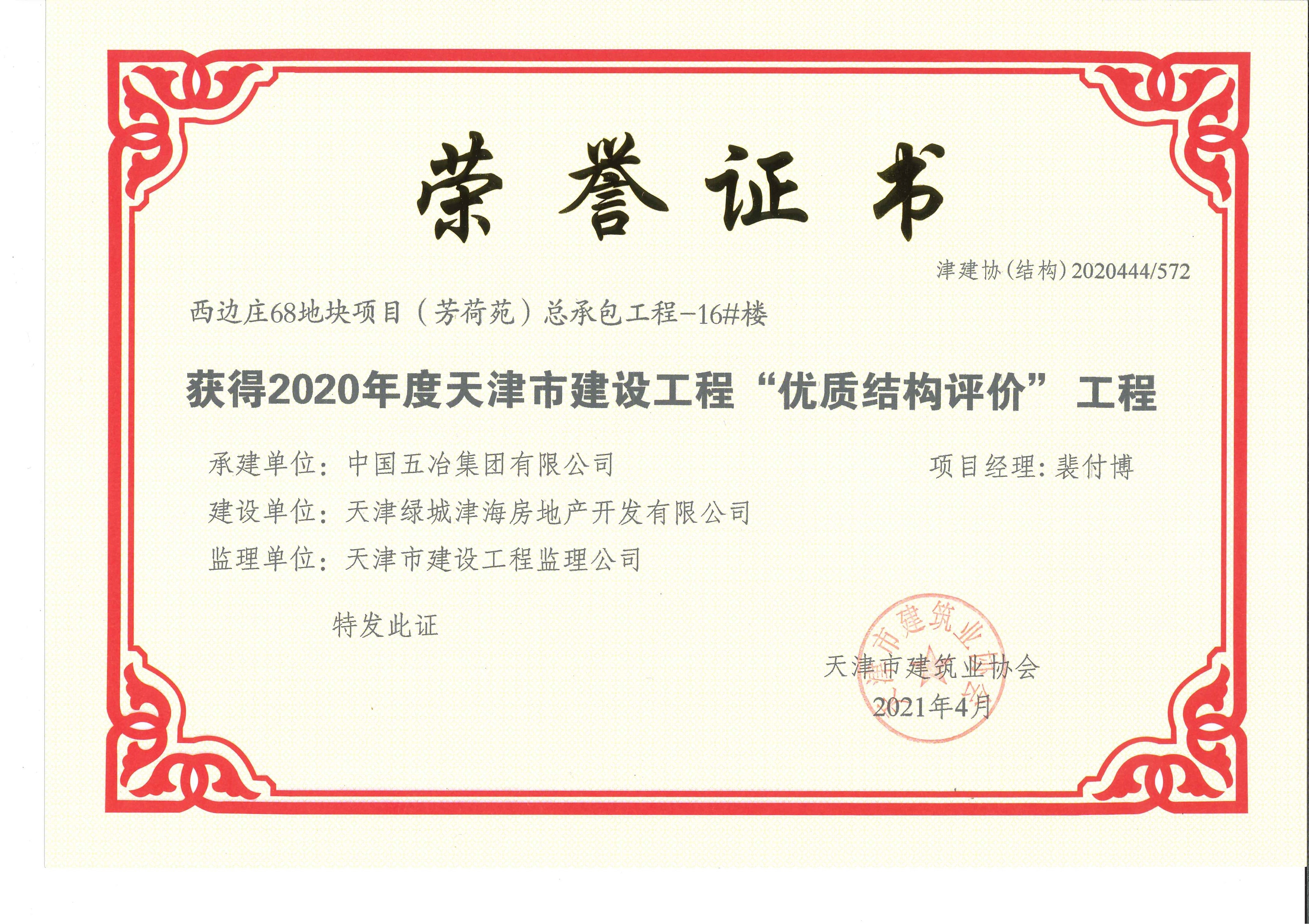 天津靜海綠城(西邊莊68地塊項目-芳荷苑總承包工程-16號樓)--2020年天津優質結構評價