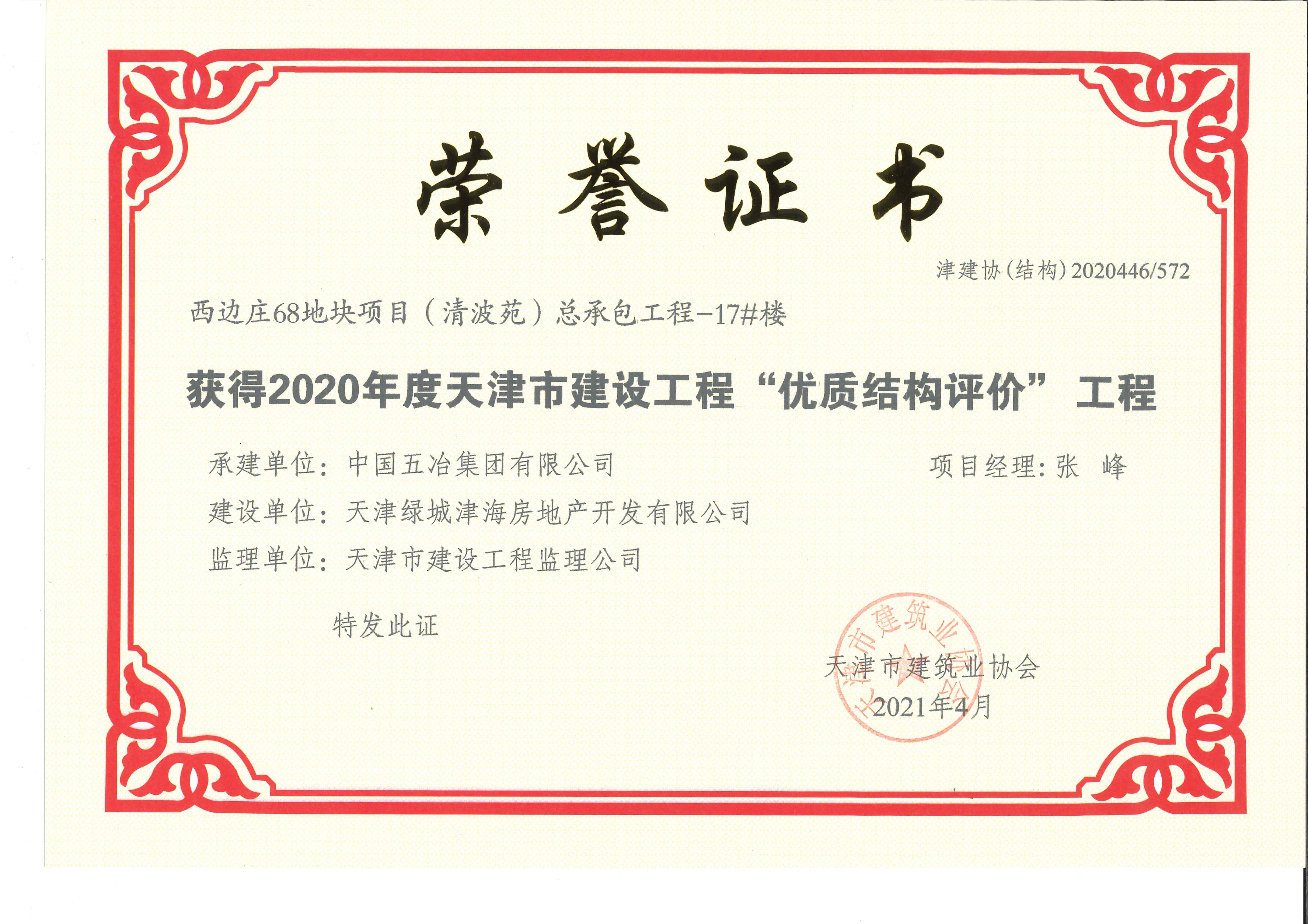 天津靜海綠城(西邊莊68地塊項目-清波苑總承包工程-17號樓)--2020年天津優質結構評價