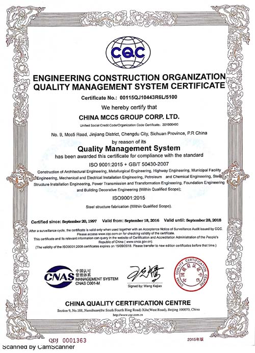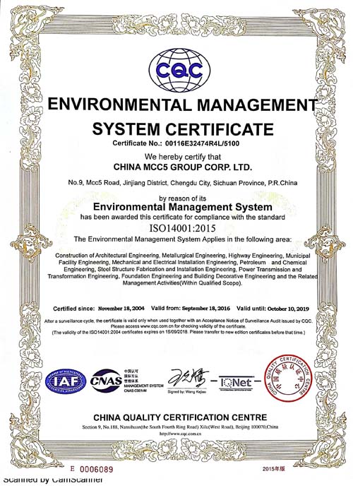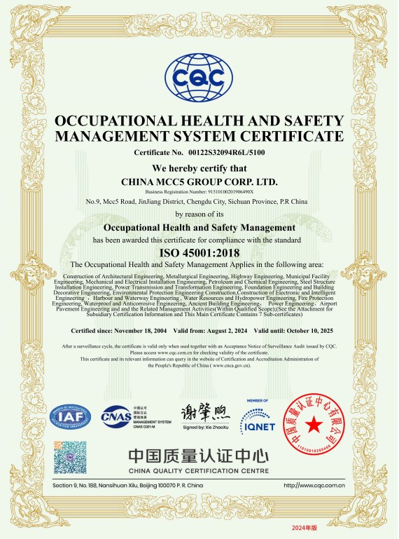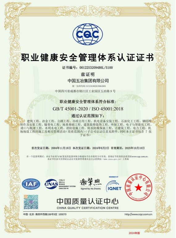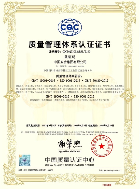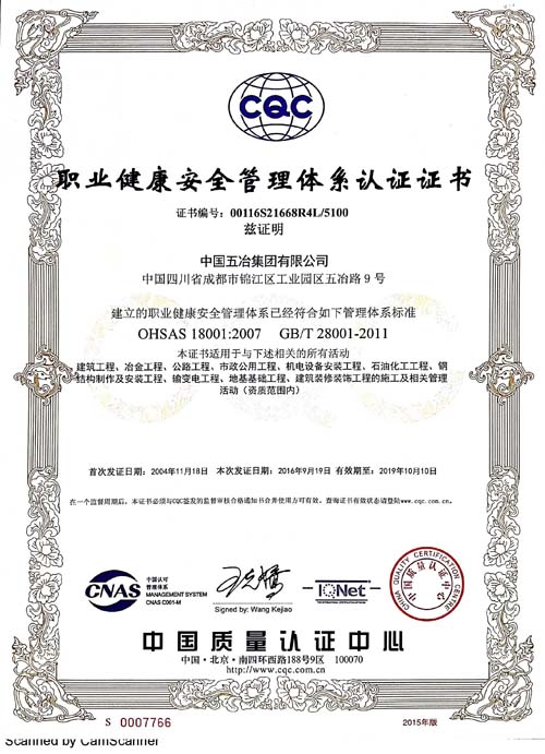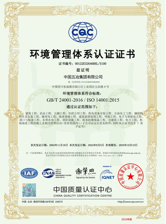 中國五冶集團有限公司(以下簡稱中國五冶集團),1997年通過ISO9000質量體系認證。2004年,中國五冶集團按照ISO9001、ISO14001、OHSAS18001國際標準要求,建立質量環(huán)境職業(yè)健康安全整合型管理體系并通過三標一體認證。2011年,中國五冶集團按照GB/T50430-2007《工程建設施工企業(yè)質量管理規(guī)范》要求,建立并通過質量環(huán)境職業(yè)健康質量管理規(guī)范的三標一規(guī)范體系認證,至今保持三標一規(guī)范管理體系連續(xù)、平穩(wěn)和協(xié)調運行。