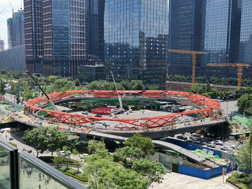 該項目位于成都市高新區(qū)益州大道路口,屬交子金融大街形象提升工程中的重點項目。中國五冶集團主要承建該項目的鋼結(jié)構(gòu)制安部分,屬異形空間結(jié)構(gòu),是整個施工環(huán)節(jié)技術(shù)含量最高,難度最大的部分。交子之環(huán)內(nèi)直徑90米,外直徑110米,主要包括結(jié)構(gòu)環(huán)、交通環(huán)和風雨環(huán)廊三部分,工程量約3500噸。