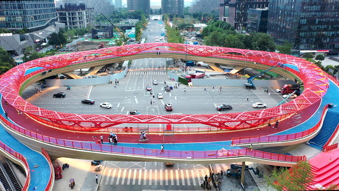 以高顏值爆紅的“交子之環”景觀橋,由結構環、交通環和風雨環廊三部分構成。寬達10米、周長300米的橋面將陸續呈現通行、休閑、表演、運動等場景,使其成為全國首座擁有多元場景的人行天橋。