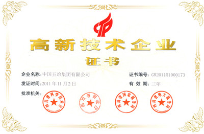 ??2011年11月,中國五冶集團榮獲由國家科技部核準,四川省科學技術廳、財政廳、國家稅務局、地方稅務局頒發的“高新技術企業”證書。
