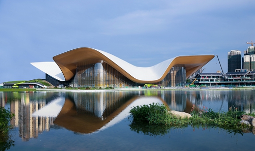 在位于成都市中的金牛區,波光粼粼的平湖之畔佇立著一座既有金屬光澤,又有現代藝術美感的芙蓉花建筑,與旁邊川西山脈般連綿起伏的場館相映成趣。花型、綠意、山勢、水波在日光下交織,于水天交接之處呈現出別樣的城市公園韻味。這,就是中國五冶集團承建的天府藝術公園·文博坊片區建設項目。