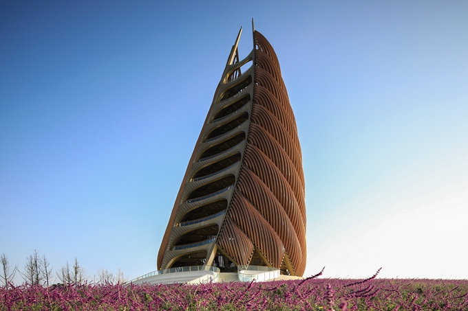 同時,為最大程度模擬“春筍”表面的紋理與脈絡,在裝飾裝修階段,項目團隊共采用了近672根單曲不重復的弧形月牙格柵來編織“春筍”的全曲面幕墻外衣,每一根格柵的大小、形狀都不一樣,最大的一根格柵長度達13.688米,自重超600公斤,所有格柵必須嚴密對應,每一根格柵和指定位置的偏差必須控制在3毫米內,為此項目團隊采用BIM技術來實現精密“織衣”:運用全站儀將各編號關鍵點進行測放,確定不同軸間每根月牙格柵連接件的坐標、軸線等關鍵定位點,保證安裝就位精度。與此同時,為了更好地還原“春筍”景觀,觀光瞭望塔在噴漆著色等細節處理上也頗有講究,其外部格柵為淺褐色,在夕陽下泛起淡紅帶金的光澤,配合上包裹著金色GRP材料的鋼結構框架,生動地以建筑呈現出自然之美。