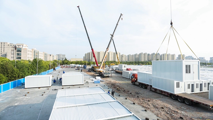 開局就是決戰(zhàn)。面對極限工期,中國五冶千余名建設者、數(shù)百臺各類施工機械通宵鏖戰(zhàn)、晝夜不停工。場地平整、混凝土澆筑、集裝箱吊裝、水電安裝、弱電智能等數(shù)十個專業(yè)交叉作業(yè)、同步推進,隔離點建設分秒必爭,與疫情搶跑。因該項目采取設計施工一體化建設模式,設計公司勘察設計團隊4月30日深夜即抵達施工現(xiàn)場,2小時完成設計平面布置及設備材料計劃提報,6小時完成項目施工圖,為現(xiàn)場快速采購、科學規(guī)劃施工節(jié)點提供了有力保障。面對項目極限工期下的大規(guī)模物資采購及運輸,五冶兩級公司經(jīng)營系統(tǒng)抽調精兵強將24小時掛圖作戰(zhàn),從華東六省緊急調配部署集裝箱1000余個,首批集裝箱5月1日凌晨即抵達施工現(xiàn)場。在施工過程中,公司防疫辦與現(xiàn)場密切聯(lián)系配合,安排部署專人做好現(xiàn)場疫情防控,針對現(xiàn)場千名施工管理人員每人每日進行單管核酸檢測,確保疫情防控和工程搶建兩手抓兩不誤。在連日緊張的施工過程中,公司不斷動態(tài)優(yōu)化設計和施工方案,果斷靈活部署多點位、多專業(yè)協(xié)同交叉作業(yè),確保施工無縫銜接,現(xiàn)場24小時施工安全有序、高效進行。