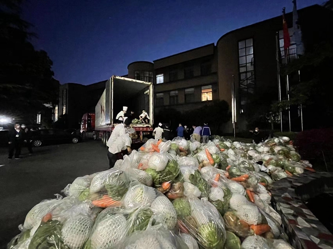 面對物資供應緊張等挑戰,五冶組織在滬有關部門成立了物資采購、運輸保障、員工聯絡、志愿服務4個專班,先后從河南、安徽、江蘇、上海四省(市)鎖定共8萬斤蔬菜、1.6萬斤鮮豬肉,品種包括上海青、番茄、胡蘿卜、土豆、花菜、甘藍、西葫蘆、五花肉、后腿肉等。此外,還為后勤保障和單宿人員準備了640箱牛奶、方便面。