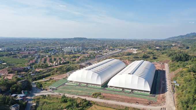 中國五冶集團四川高興煤炭儲備基地項目負責(zé)人文元介紹,目前兩座長度達308米、跨度達106米、高度達41米的大型鋼結(jié)構(gòu)煤棚已完成前期建設(shè),煤棚PVDF覆膜面積高達12萬平米,相當(dāng)于16個標(biāo)準(zhǔn)足球場的大小。在膜結(jié)構(gòu)施工過程中,中國五冶項目團隊克服了拱形結(jié)構(gòu)跨高比大、張拉精度高、施工難度大等問題,為高興煤炭儲備基地穿上“外衣”。