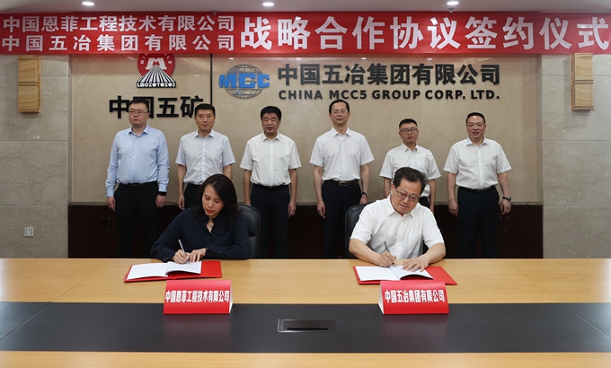 4月19日,中國五冶集團與中國恩菲工程技術有限公司簽署戰略合作協議,集團公司黨委書記、董事長朱永繁,中國恩菲董事長劉誠出席并見證簽約。