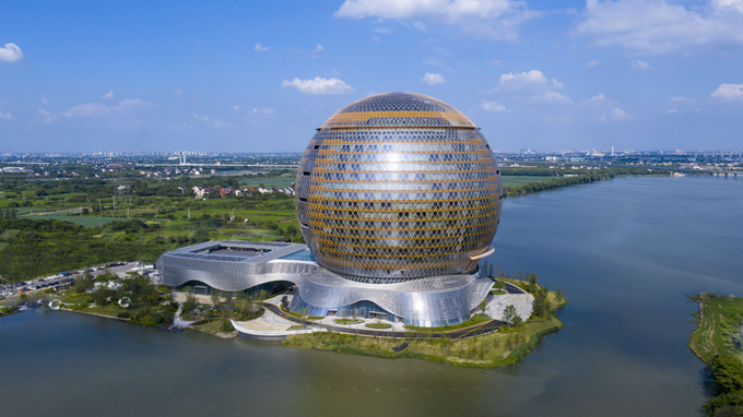 湖州太陽酒店項目位于浙江湖州南潯區,是主體直徑97.2米的世界最大球體建筑,也是集住宿、餐飲、娛樂、旅游等多功能于一體的五星級綜合性酒店。項目通過深度應用建筑信息技術,建立了覆蓋各個專業和建設全周期的“全科醫生檔案”,不僅為施工質量及安全保駕護航,同時,針對球體鋼結構、單層穹頂網殼提升、弧形管道深化及預制等方面難題重點突破,讓太陽得以驚艷“閃耀”,成為湖州的城市地標和熱門網紅打卡點。
