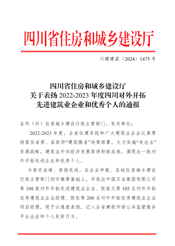 近日,四川省住房和城鄉建設廳印發《關于表揚2022-2023 年度四川對外開拓先進建筑業企業和優秀個人的通報》,中國五冶集團榮獲多項表彰。