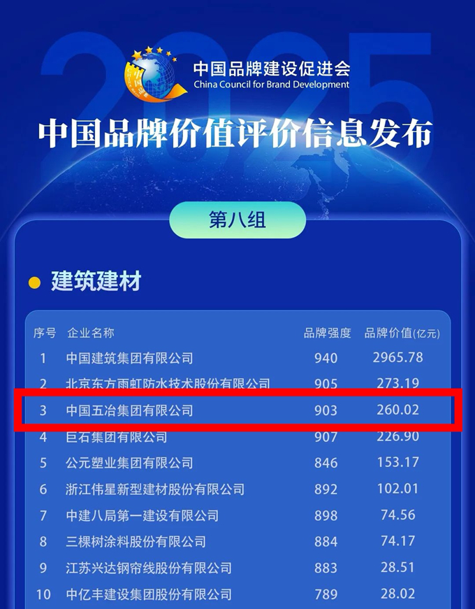 5月10日,第九個中國品牌日系列活動期間,中國品牌建設促進會聯合新華社、中國資產評估協會等單位聯合發布“2025中國品牌價值評價信息”,經權威評估,中國五冶集團品牌價值達到260.02億元,較去年增長15.3%,位列全國建筑建材領域參評企業前茅。